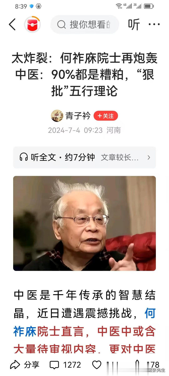 何祚庥按1:9的比例对中医“盖棺论定”,说它九成是不科学的,但并莫得巨擘统计学的数据守旧,而“冲口而出”可不是科学的传统。淌如何祚庥认为他说的是对的,恕我孤陋寡闻,请拿出具体的论据来,让我和高大网友看一下,以理服东谈主。淌若说得对,那咱们才会坚信。淌若不是这样,那说中医“不科学”,岂不成了泼妇骂街,太无厘头了。